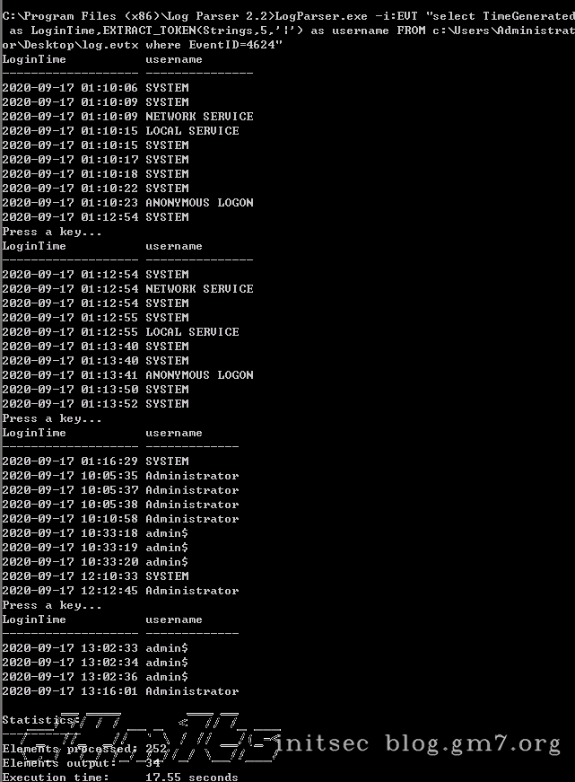 LogParser.exe -i:EVT "select TimeGenerated as LoginTime,EXTRACT_TOKEN(Strings,5,'|') as username FROM c:\日志路径\日志.evtx where EventID=4624"