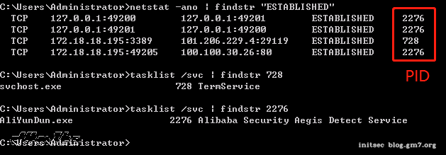 netstat -ano查看目前的网络连接、本地端口等情况,定位可疑的ESTABLISHED、LISTENING和TIME_WAIT进程pid。 b、根据查询到的pid定位到进程,tasklist /svc | findstr $PID